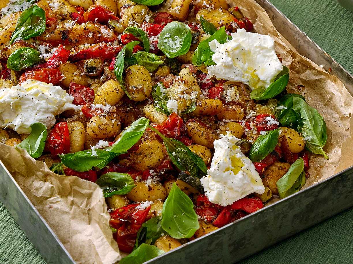 Gnocchiplåt med rostade grönsaker och burrata