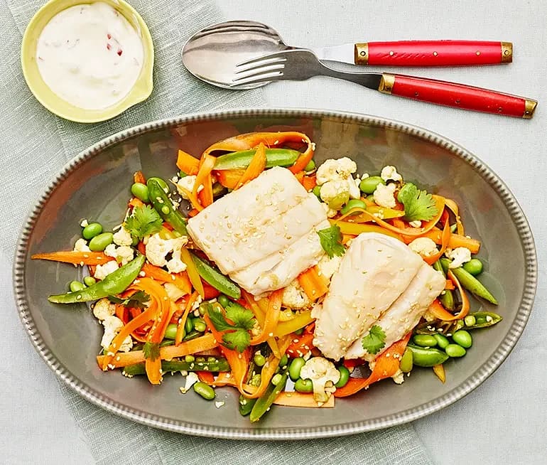Pocherad torsk med råmarinerade grönsaker och chiliyoghurt