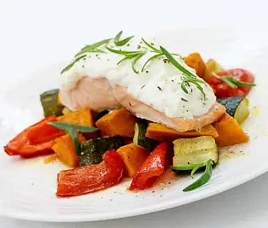 Ugnsbakad lax med gräddkokta grönsaker