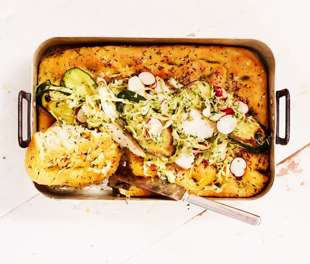 Focaccia med kyckling och citronmarinerade grönsaker