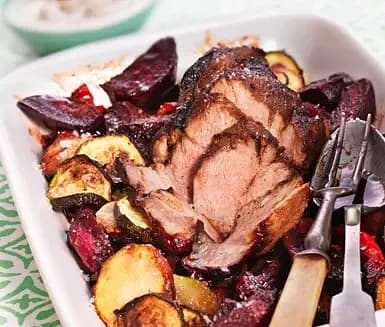 Rostad fläskkarré och grönsaker med senapskräm