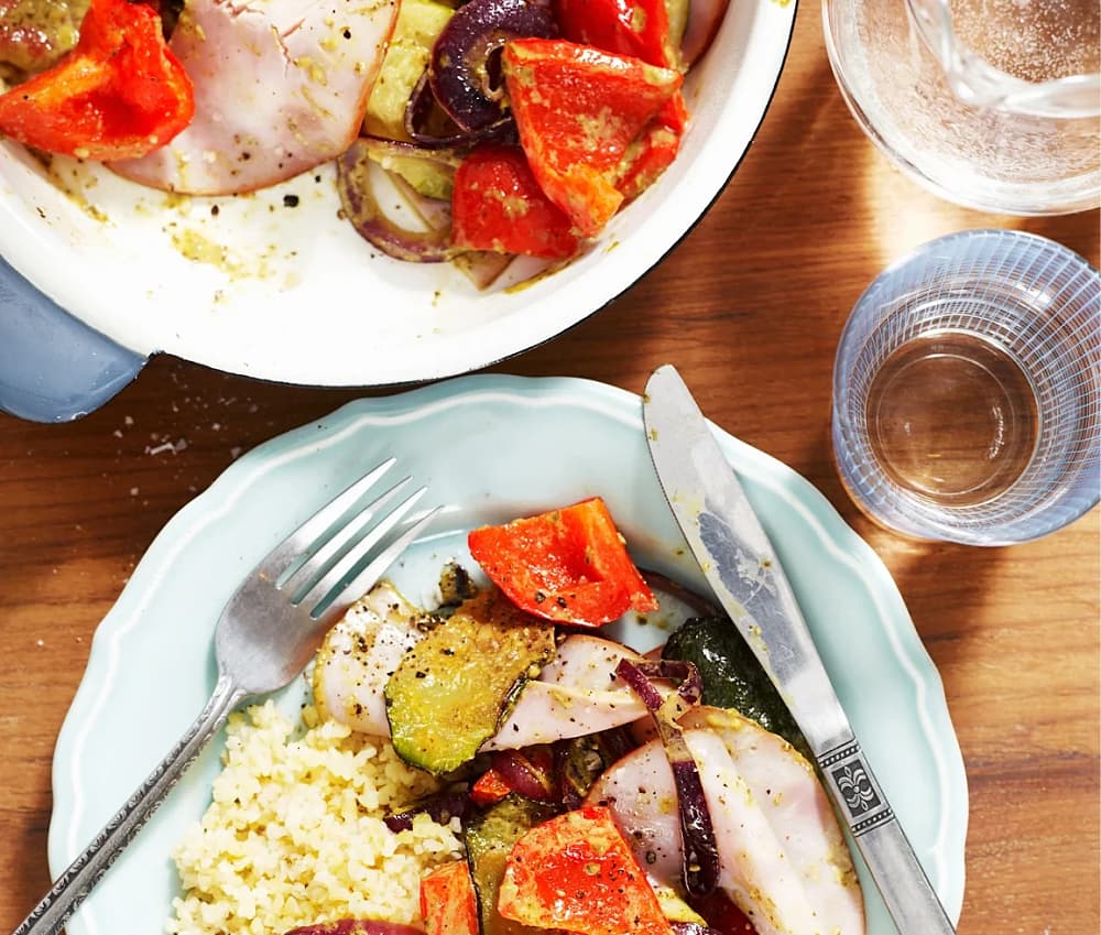 Pestorostade grönsaker med skinka
