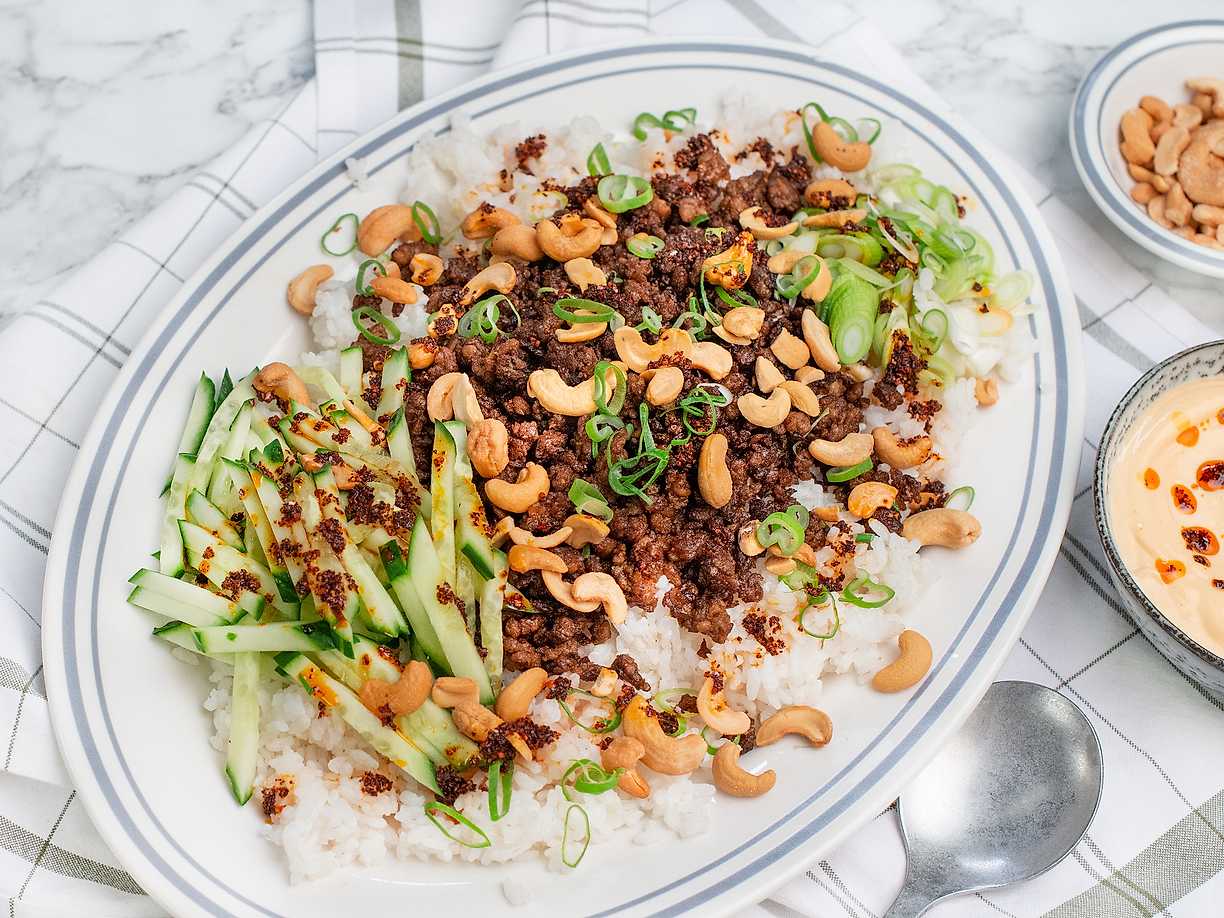 Risfat med vegofärs, grönsaker och chiliolja