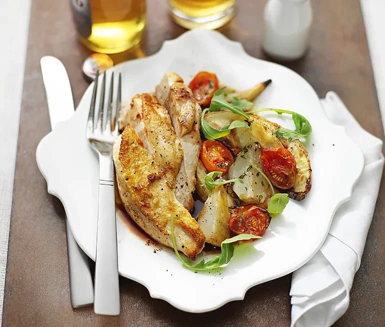 Krispigt majskycklingbröst med rostade grönsaker