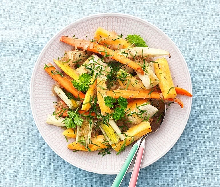 Ugnsbakade grönsaker med brynt smörvinägrett