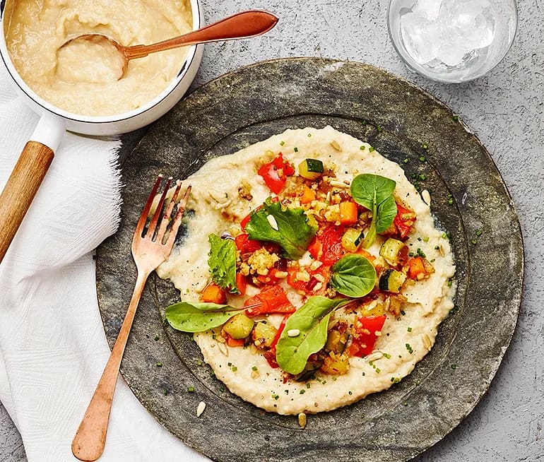 Vit böncrème med harissastekta grönsaker