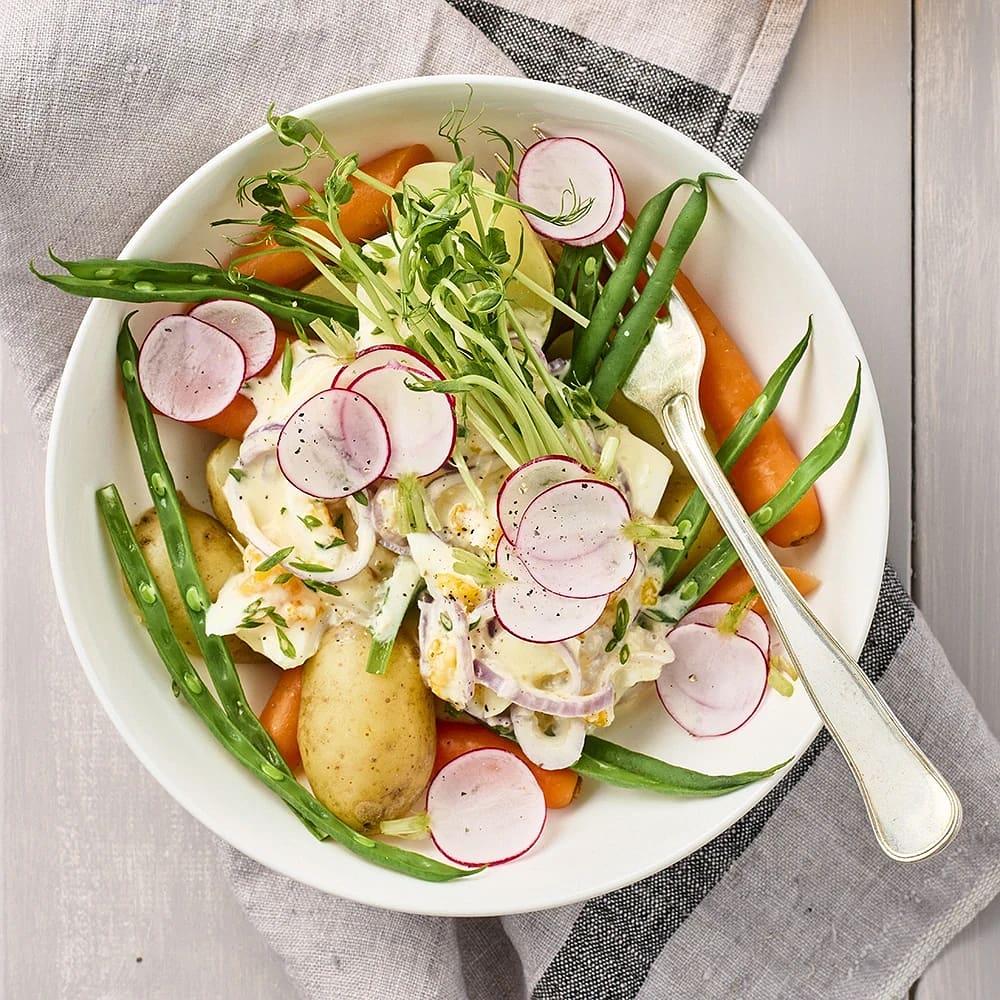 Späda grönsaker i pepparrotssås med ägg