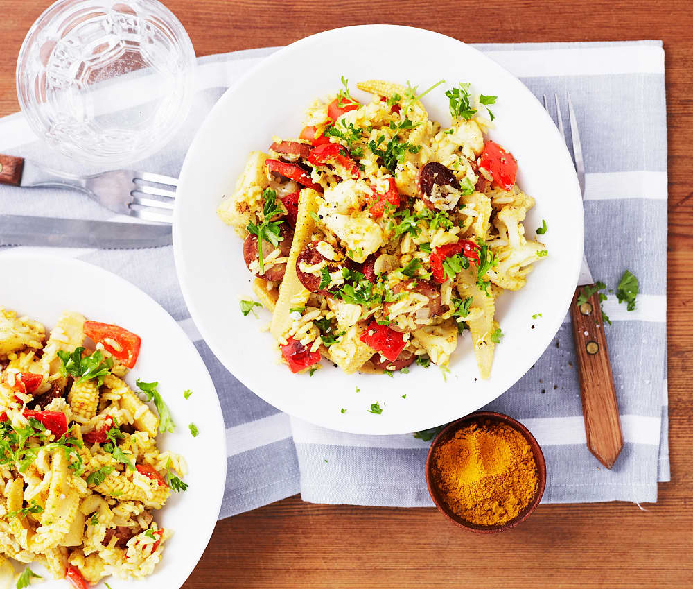 Stekt korv med curry, grönsaker och ris