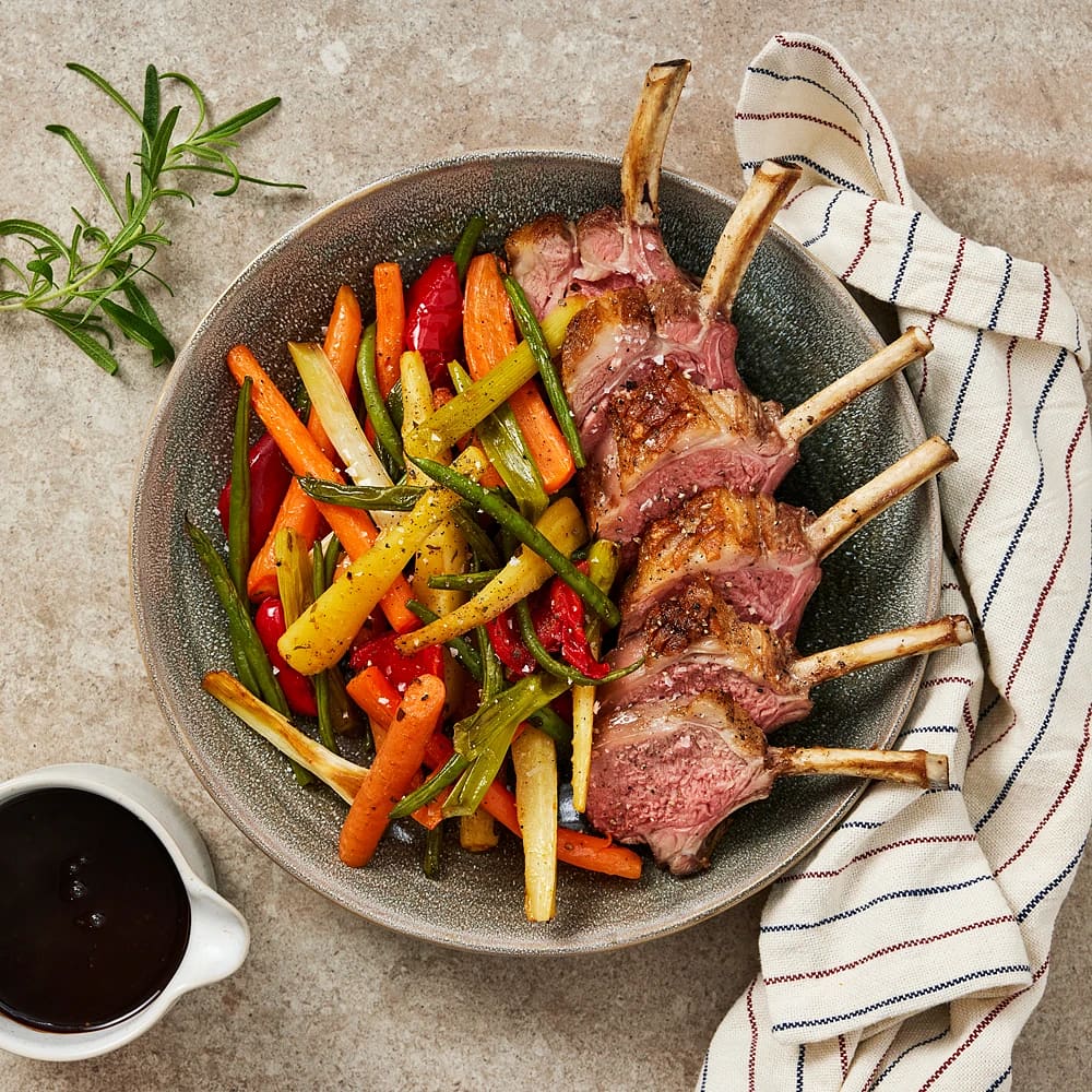 Lammracks med rostade grönsaker och balsamsky
