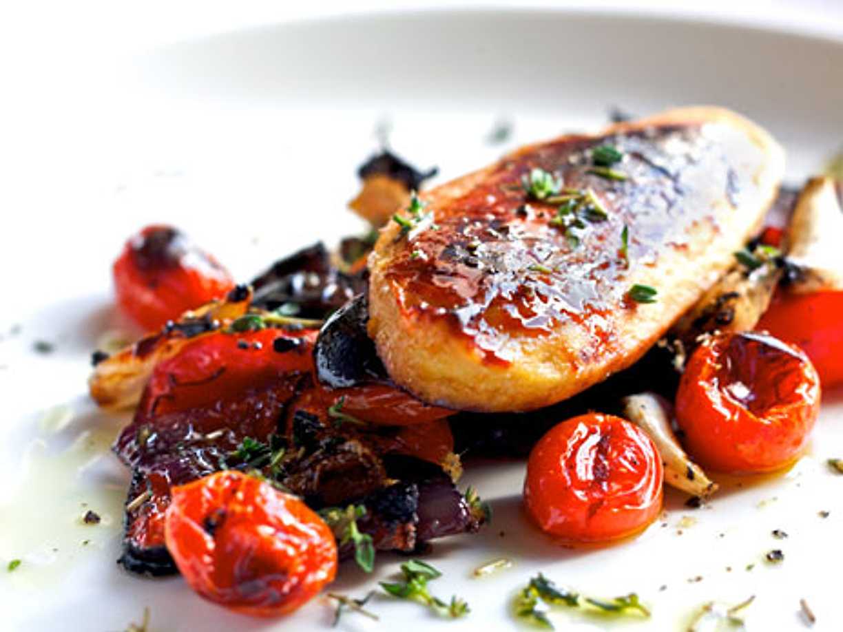Glaserade quornfiléer med ugnsrostade grönsaker