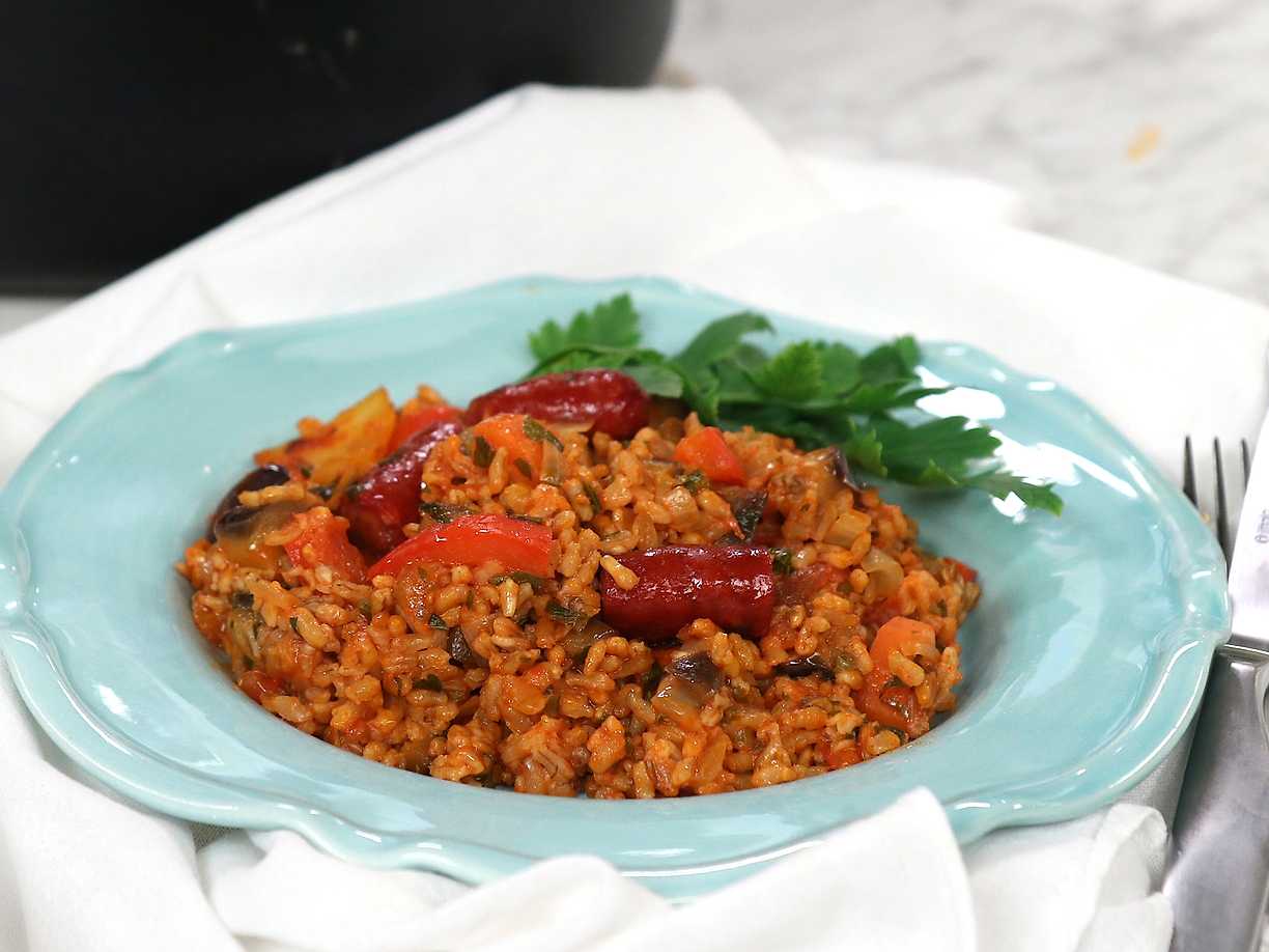 Mustigt havreris med grönsaker och lammkorv