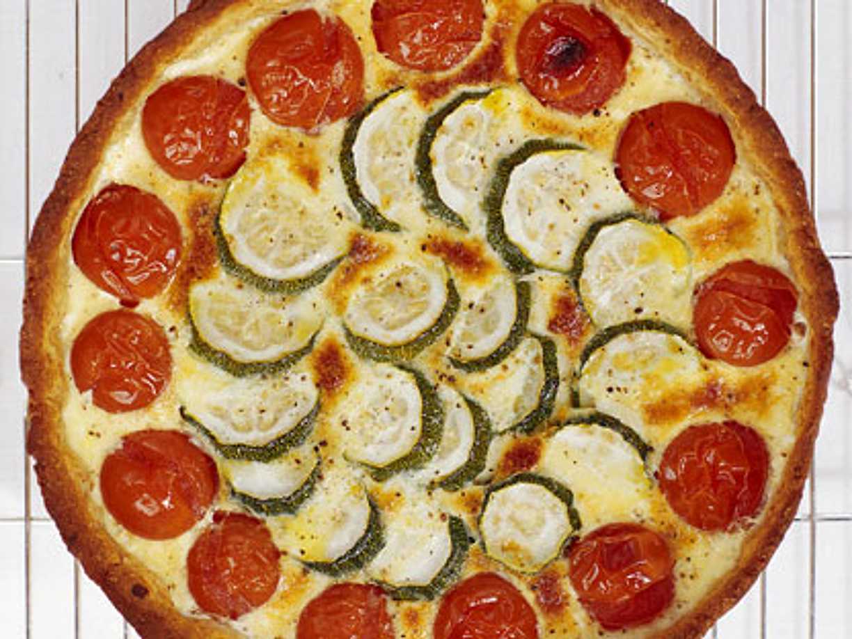 Paj med grönsaker på rad och chèvre