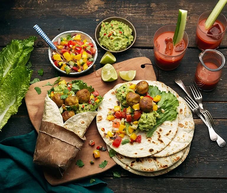 Veggie wrap med grönsaksbullar, ärtguacamole och mangosalsa