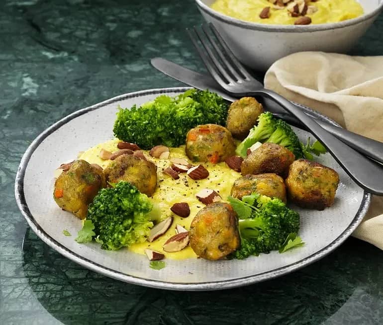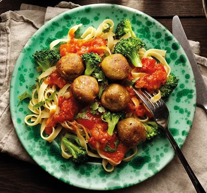 Grönsaksbullar med pasta, tomatsås & broccoli