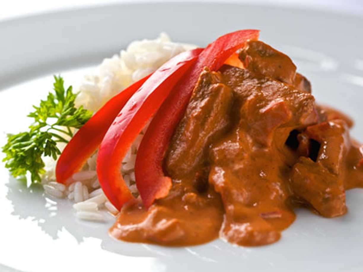 Vildsvinsgulasch med surkål, paprika och crème fraiche