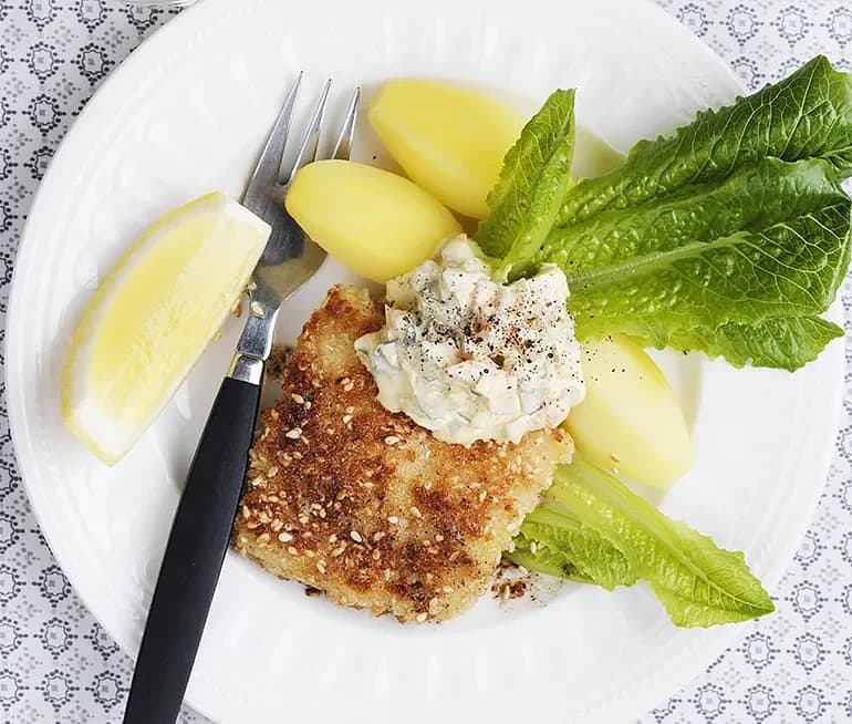 Broccoli- och majsfritters med rostad potatis och chilimajo
