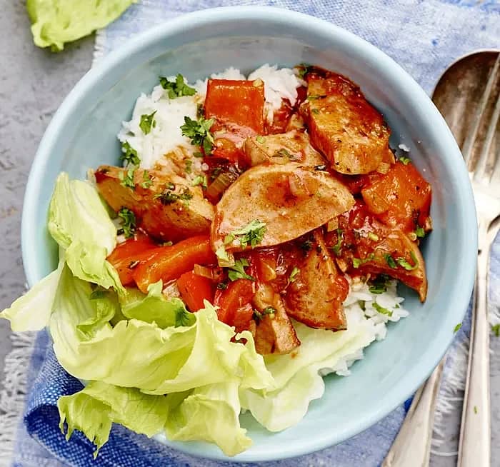 Kycklinggryta med kabanoss och syltlök