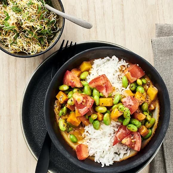 Böncurry med sojamarinerade groddar