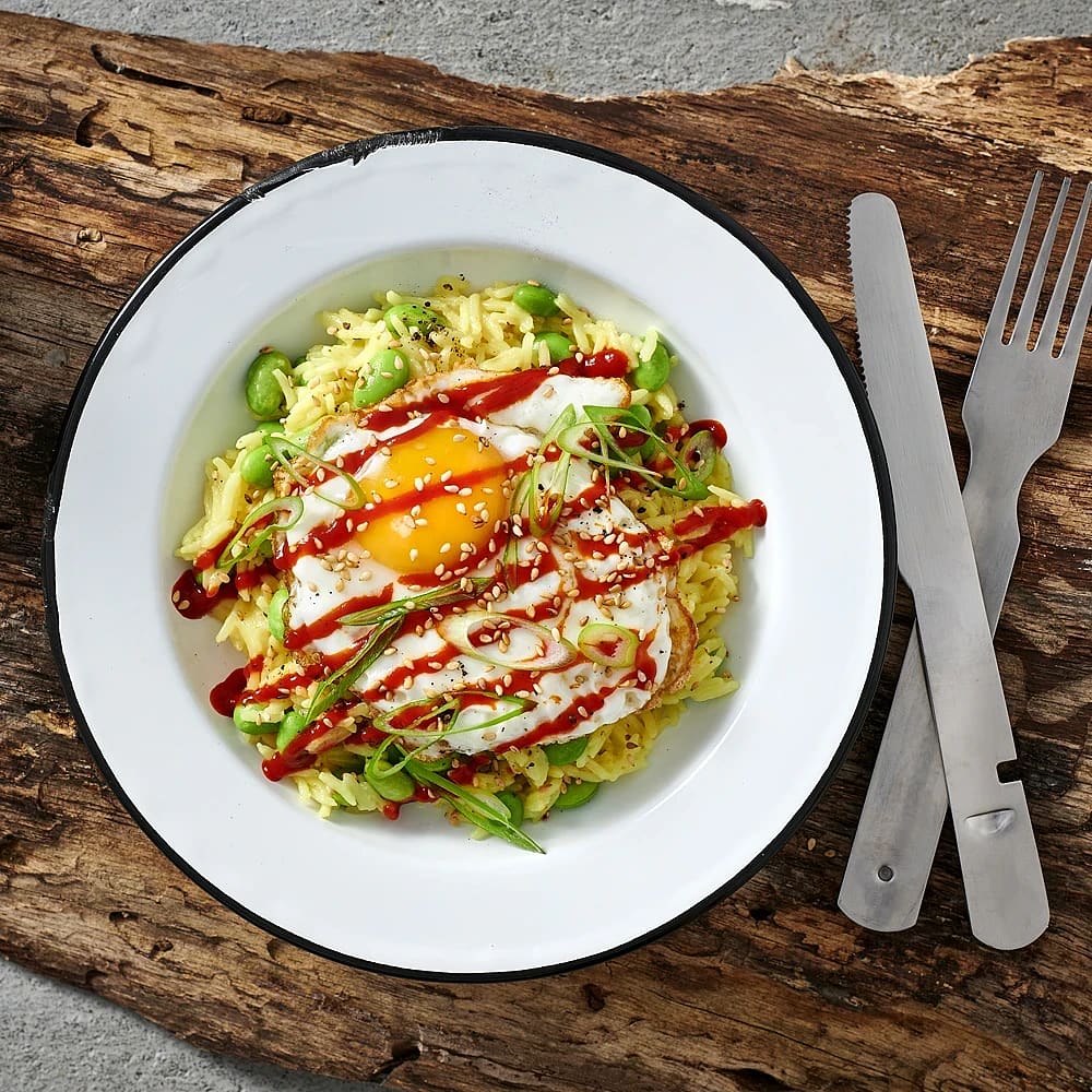 Krämigt kokosris med curry, stekt ägg och sesamfrö