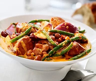 Gryta med bönor, haricot verts, persilja och korv