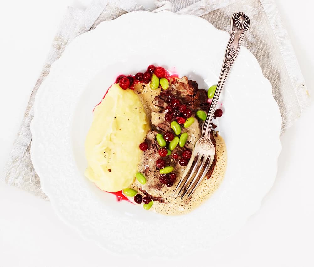 Högrev bräserad i svagdricka och enbär med syltade tranbär