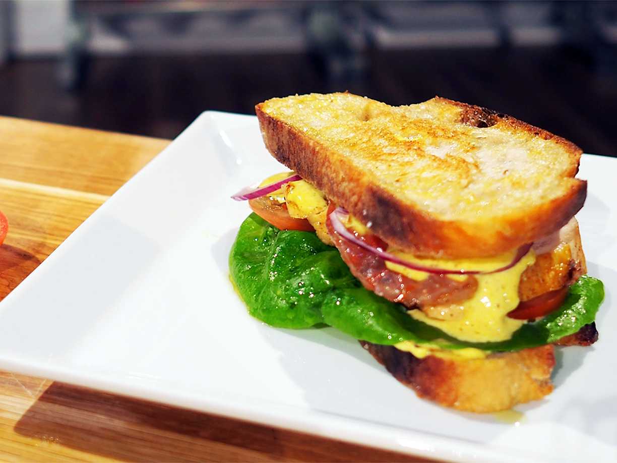 Club sandwich med kyckling och currymajonnäs