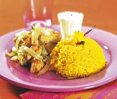 Quorn och kålfräs med gult ris och chutneyyoghurt