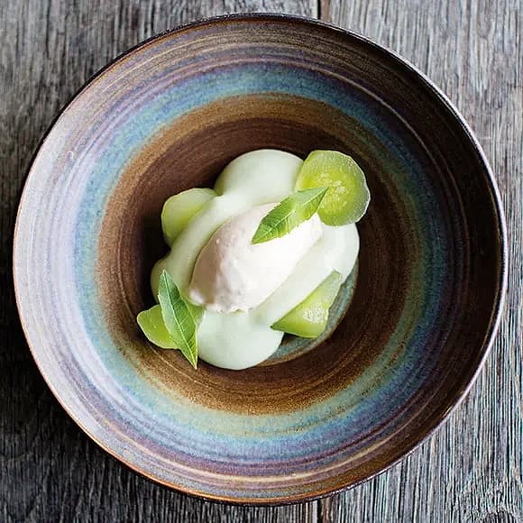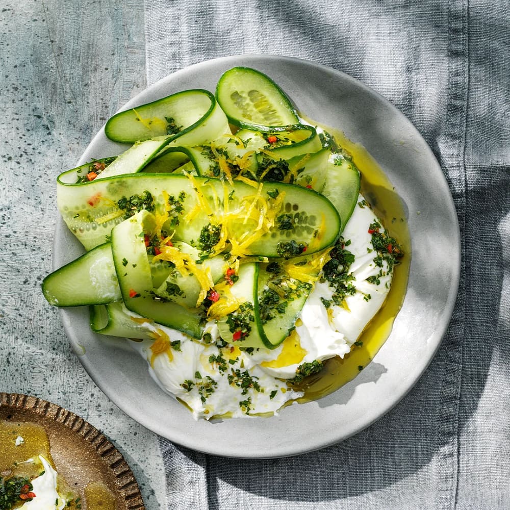 Hyvlad gurka med burrata, syltad citron och chimichurri