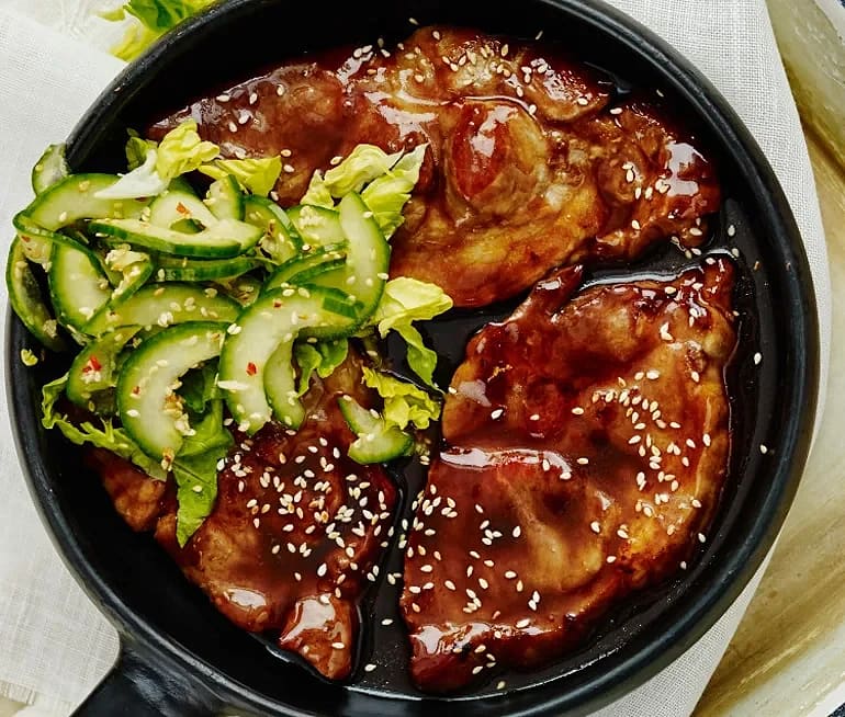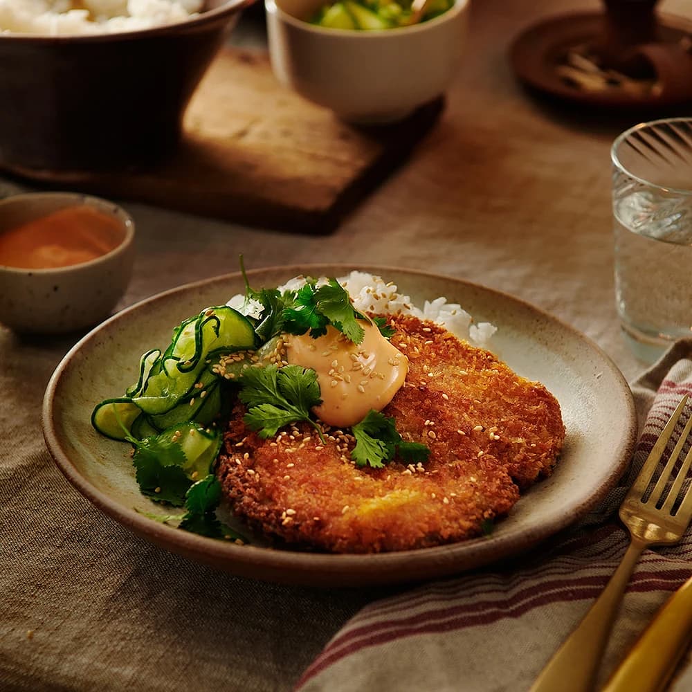 Tonkatsu med shiitake, syrlig kålsallad, het gurka och ris