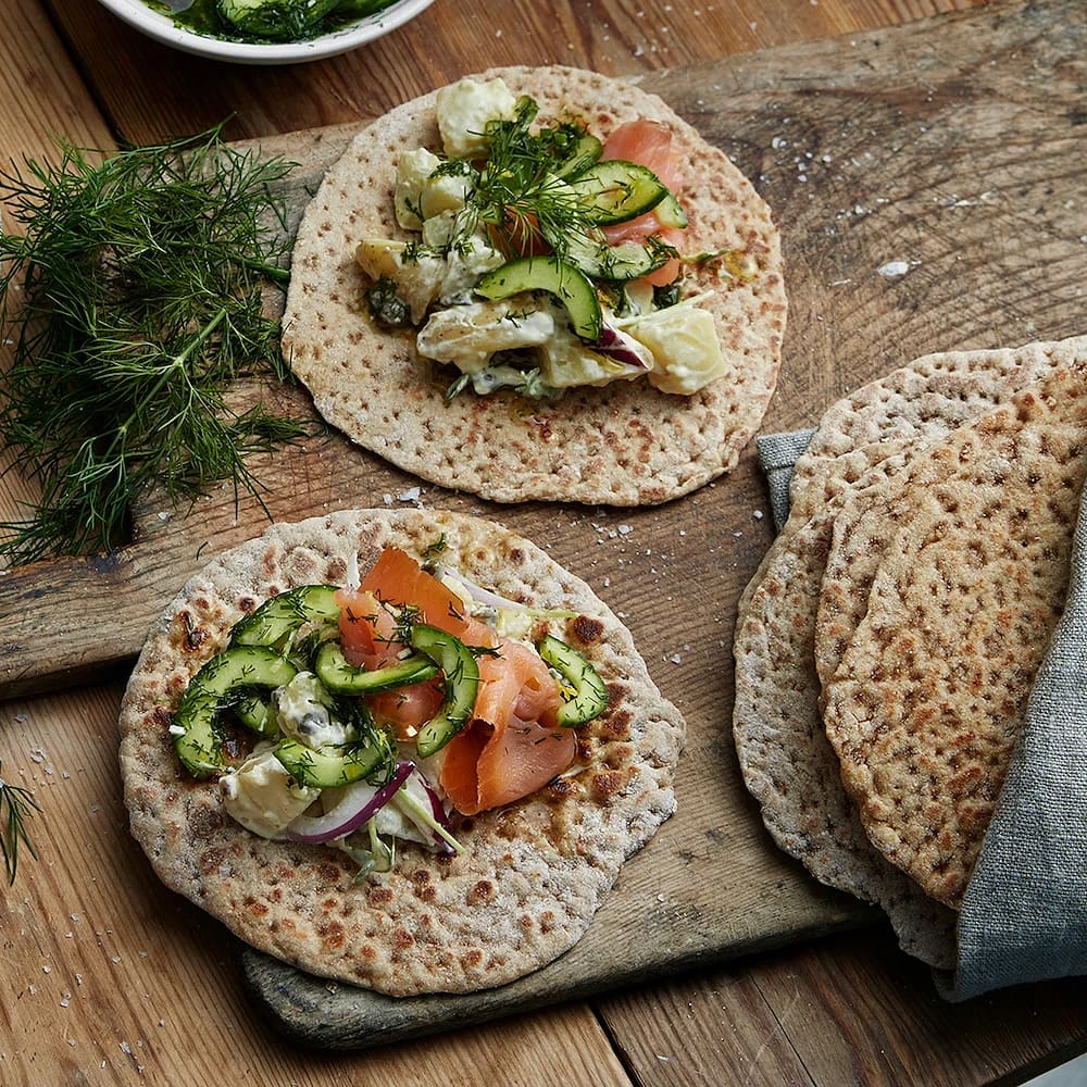 Tunnbrödsrulle med lax, senapspotatis och gremolata med gurka