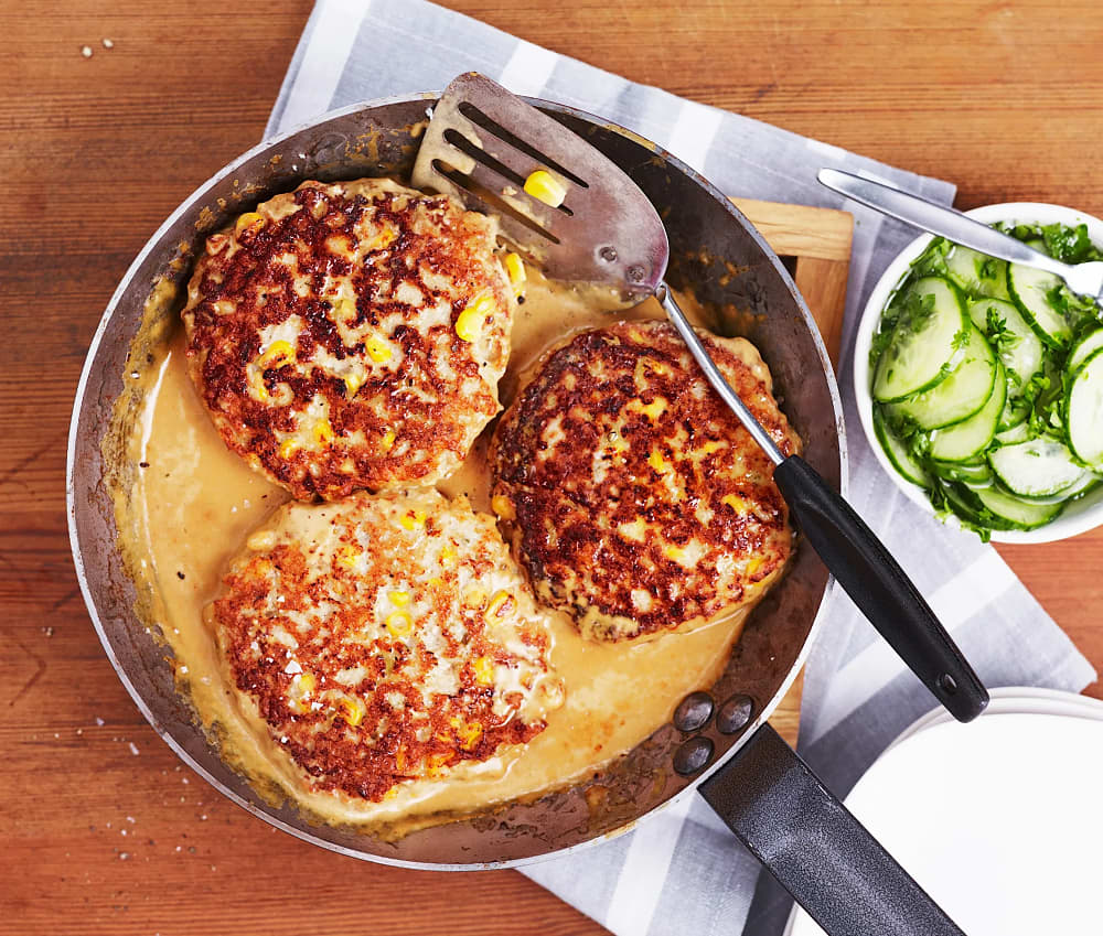 Kycklingbiffar med gräddsås och snabbinlagd gurka