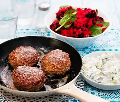 Kalvfärsbiffar med rödbetsbulgur och fetaostyoghurt med gurka
