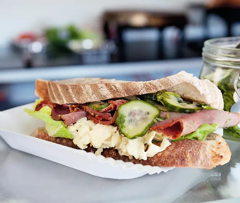 Fred’s pastrami sandwich med äppelslaw och inlagd gurka
