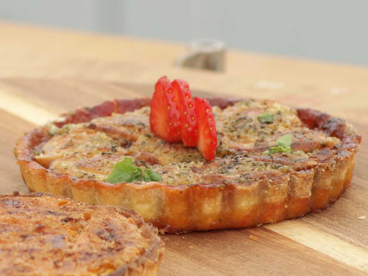Västerbottensostpaj med rökt lax, rädisor och gurka