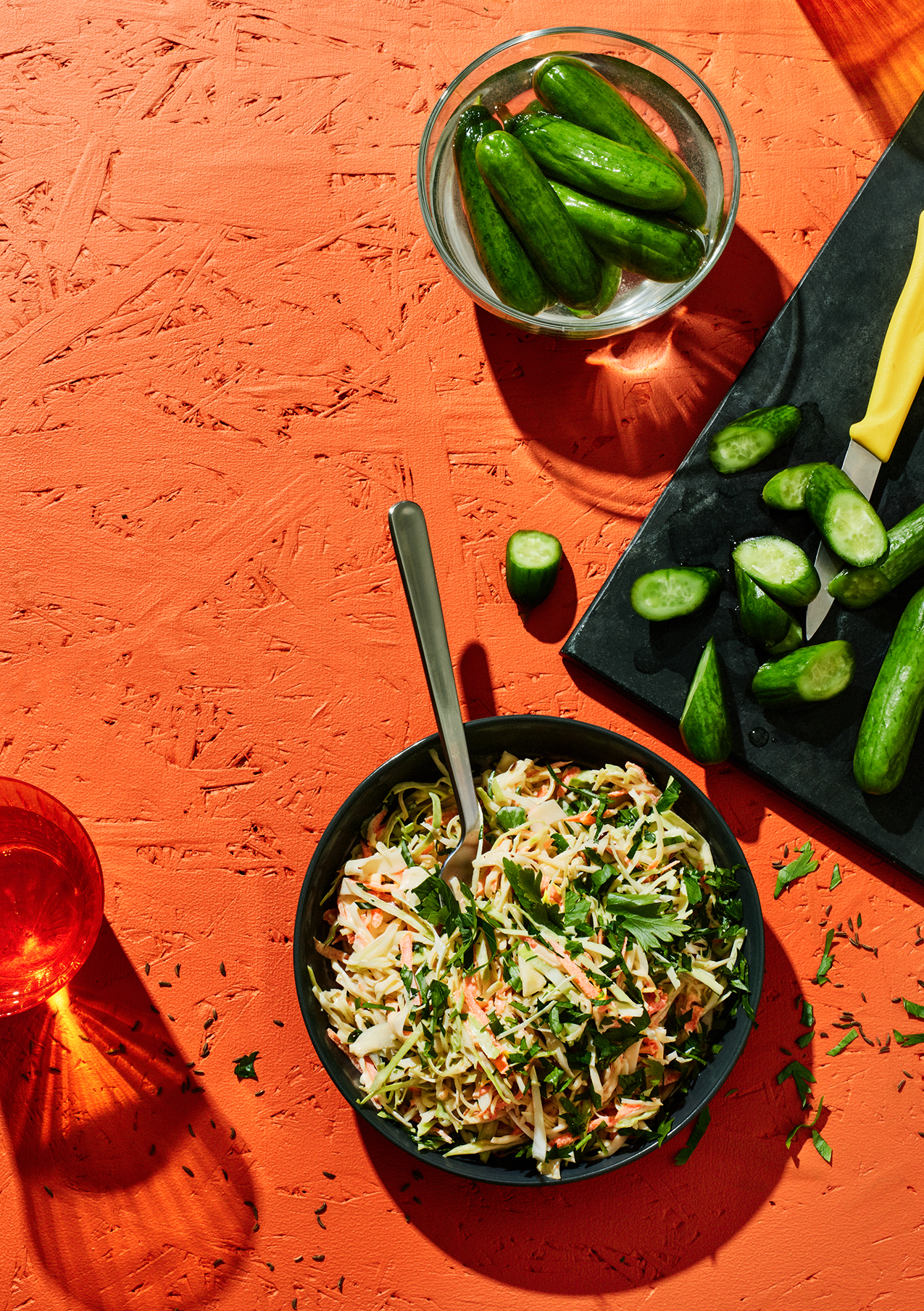 Oumphburgare med ingefärspicklad gurka och rödkålsslaw