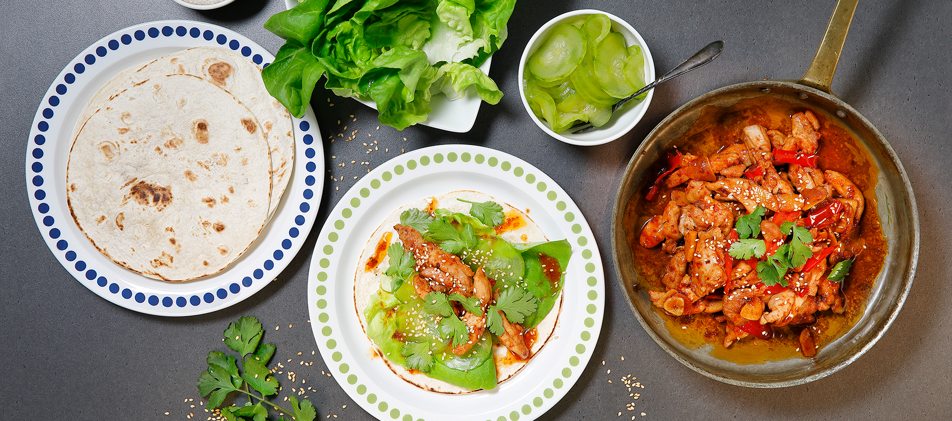 Tortilla med soja & ingefärastekt kycklinglår, picklad gurka och rostad sesamfrö
