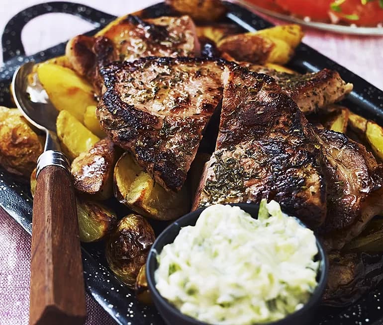 Fläskkarré med klyftpotatis och gurkröra