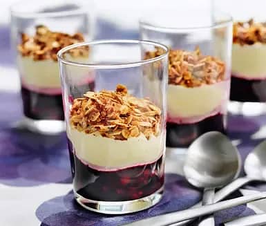Hallon- och blåbärscoupe med vaniljvisp och rostad havre
