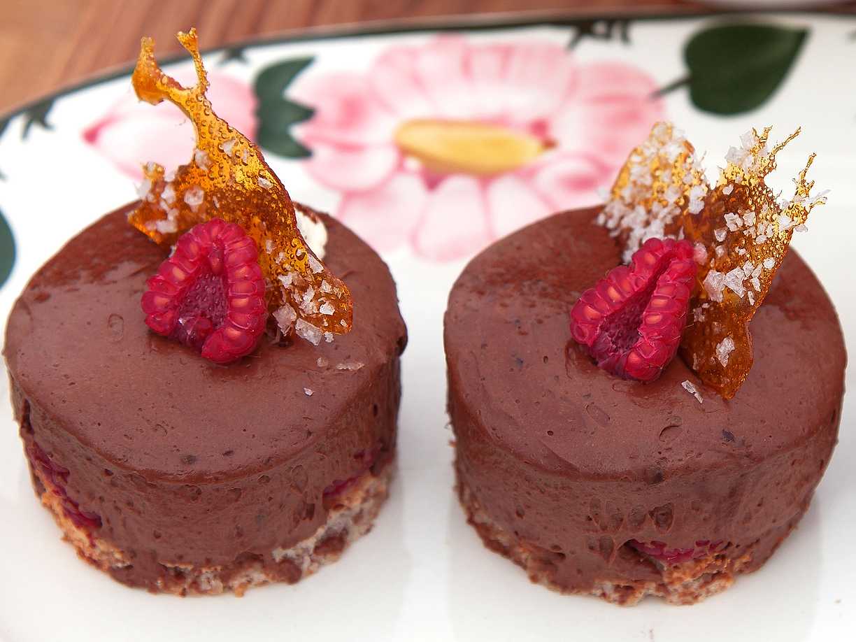 Mörk chokladmousse med hallon och lakritsrostade pecannötter