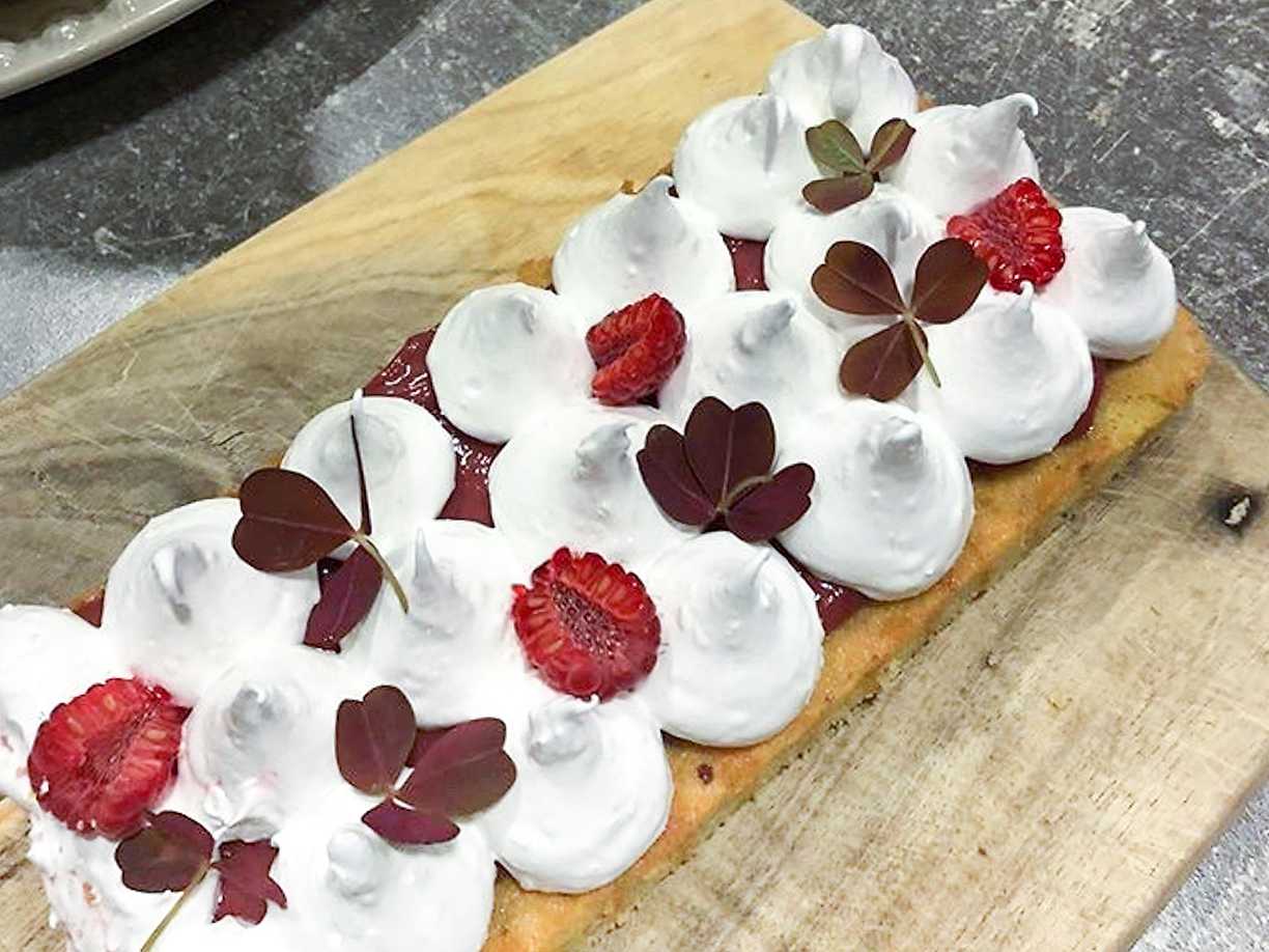 Mandel-pistagekaka med hallonkräm och kokosmaräng