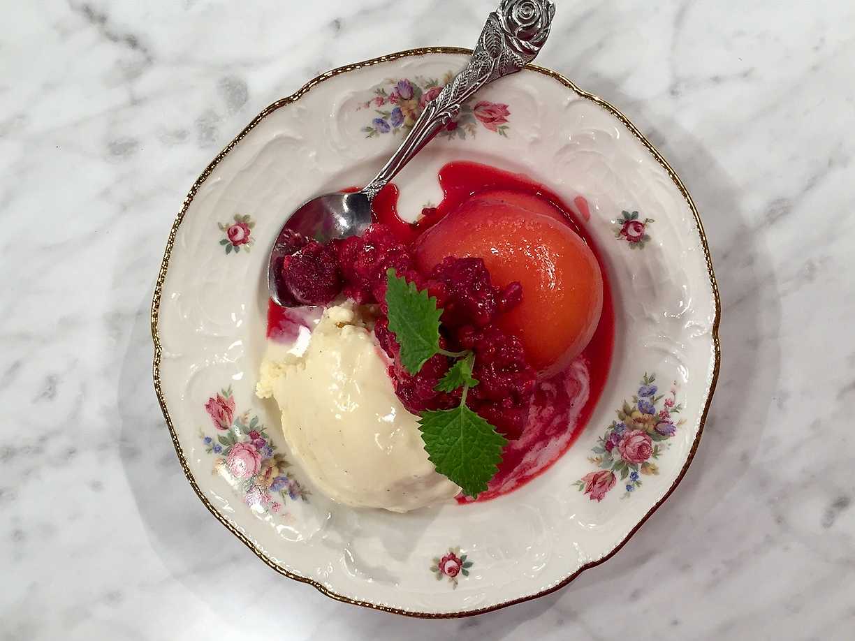 Citronmousse med hallonsås, glass, kaksmulor och maräng
