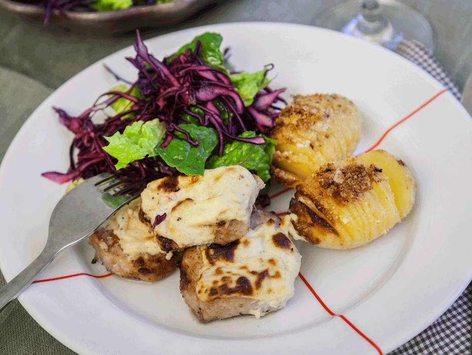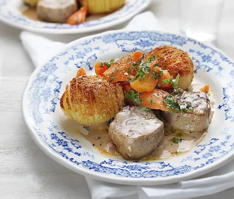 Hasselbackspotatis med färskostgratinerad fläskfilé