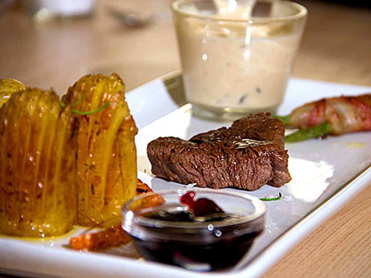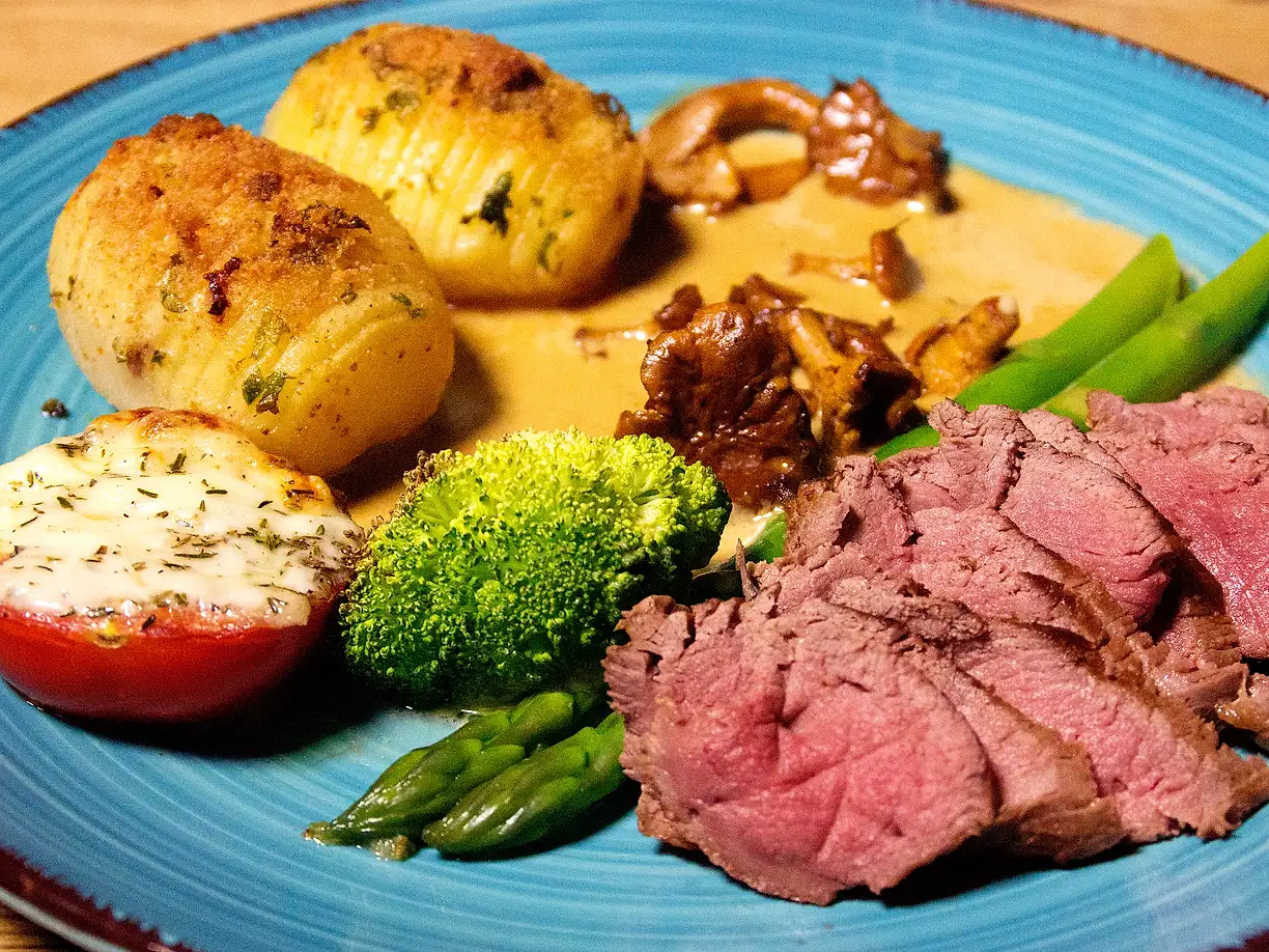 Helstekt oxfilé med hasselbackspotatis och gräddig rödvinssås