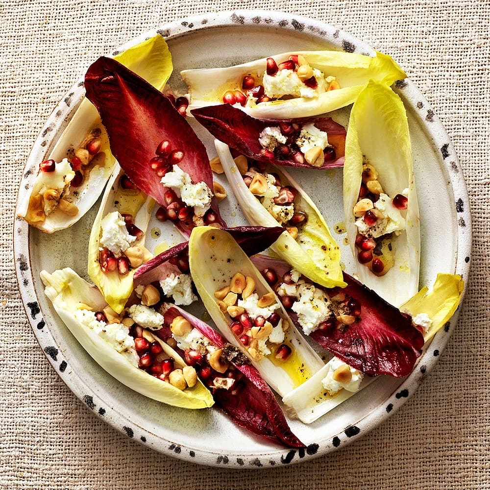 Endive med getost, hasselnötter och granatäpple