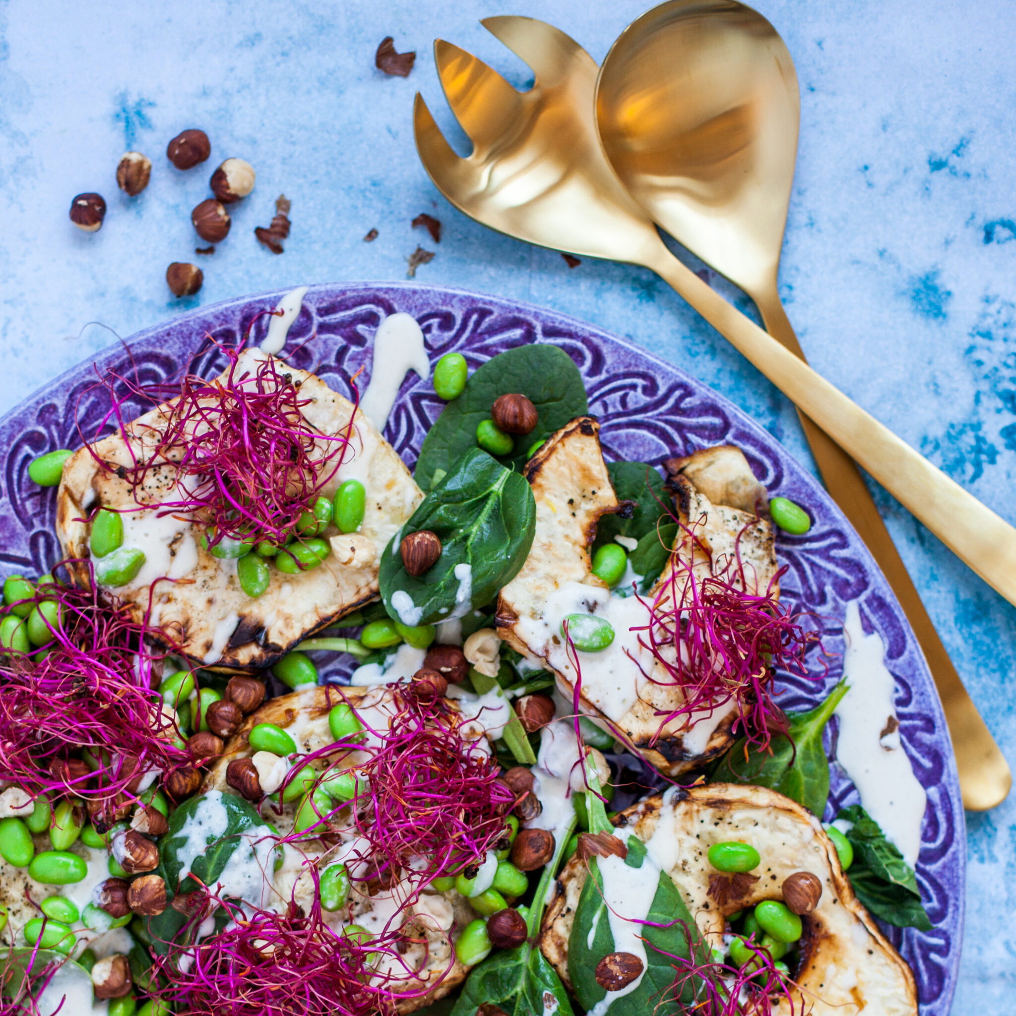 Bakad rotselleri, getostkräm, edamamebönor, hasselnötter och groddar