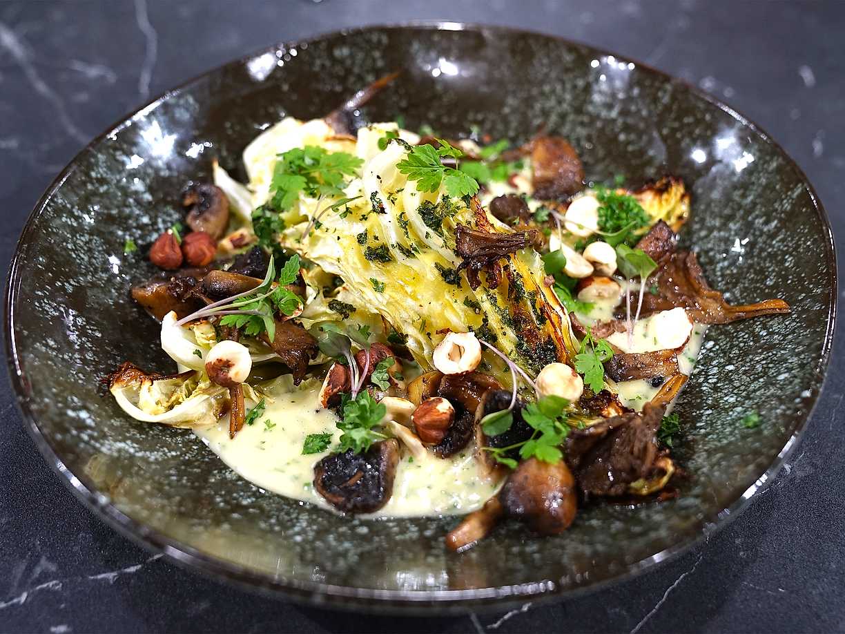 Bakad spetskål med svamp, hasselnötter och beurre blanc