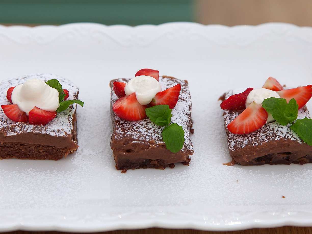 Chokladbrownie med vaniljglass, åkerbärscouli och rostade hasselnötter