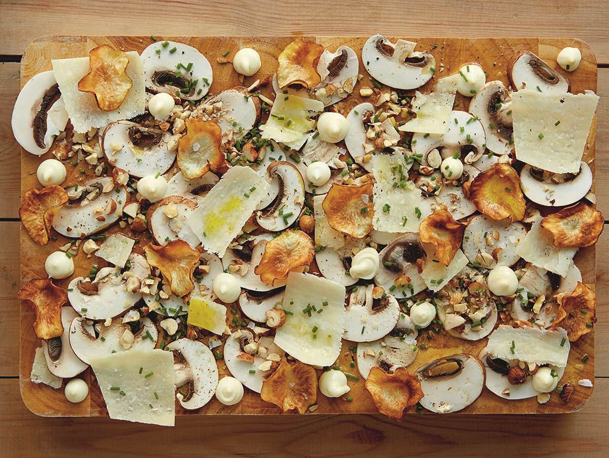 Champinjoncarpaccio med jordärtskockschips, citronmajonnäs och hasselnötter