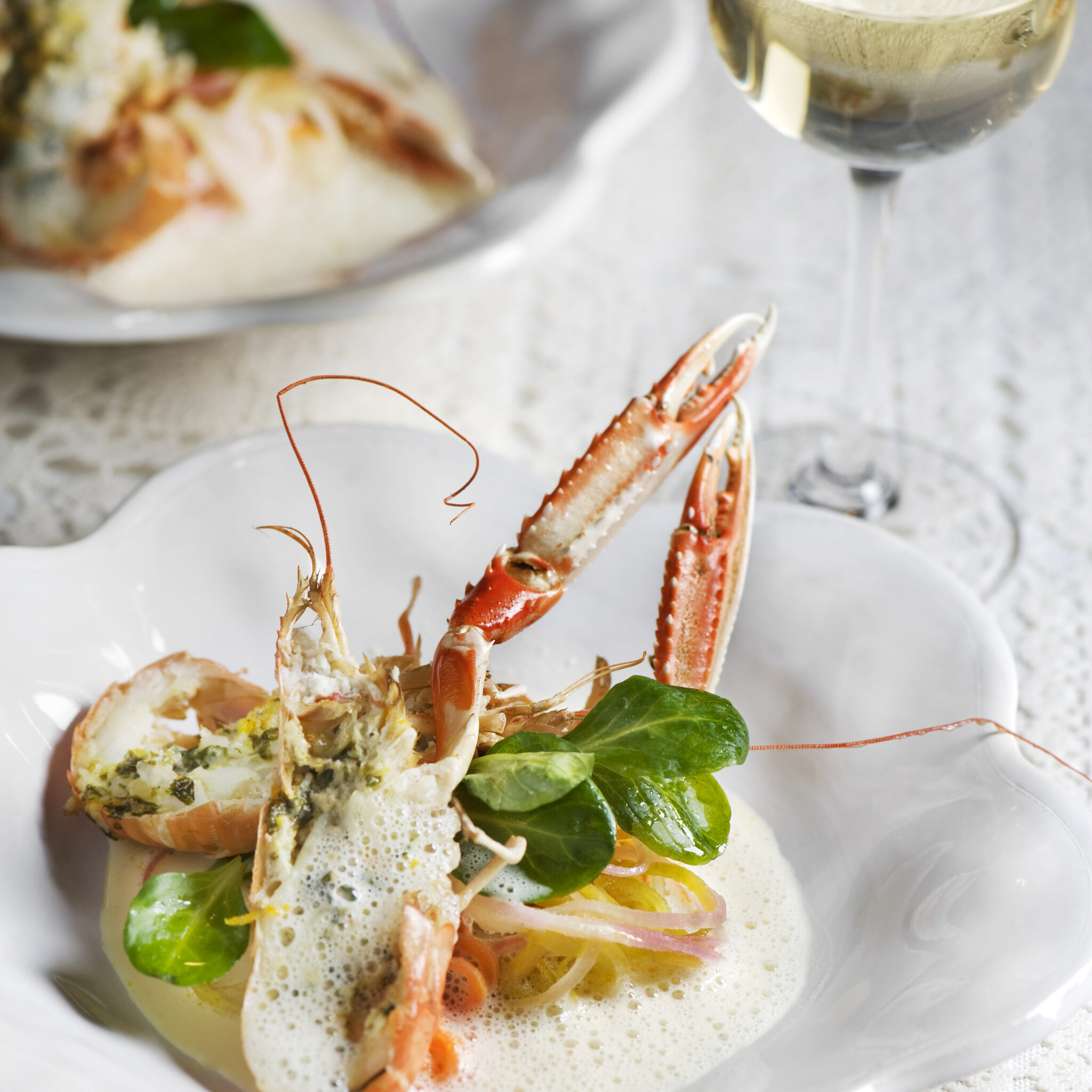 Havskräfta med krispig jordärtskocka, ingefärsmajonnäs och dillvinägrett