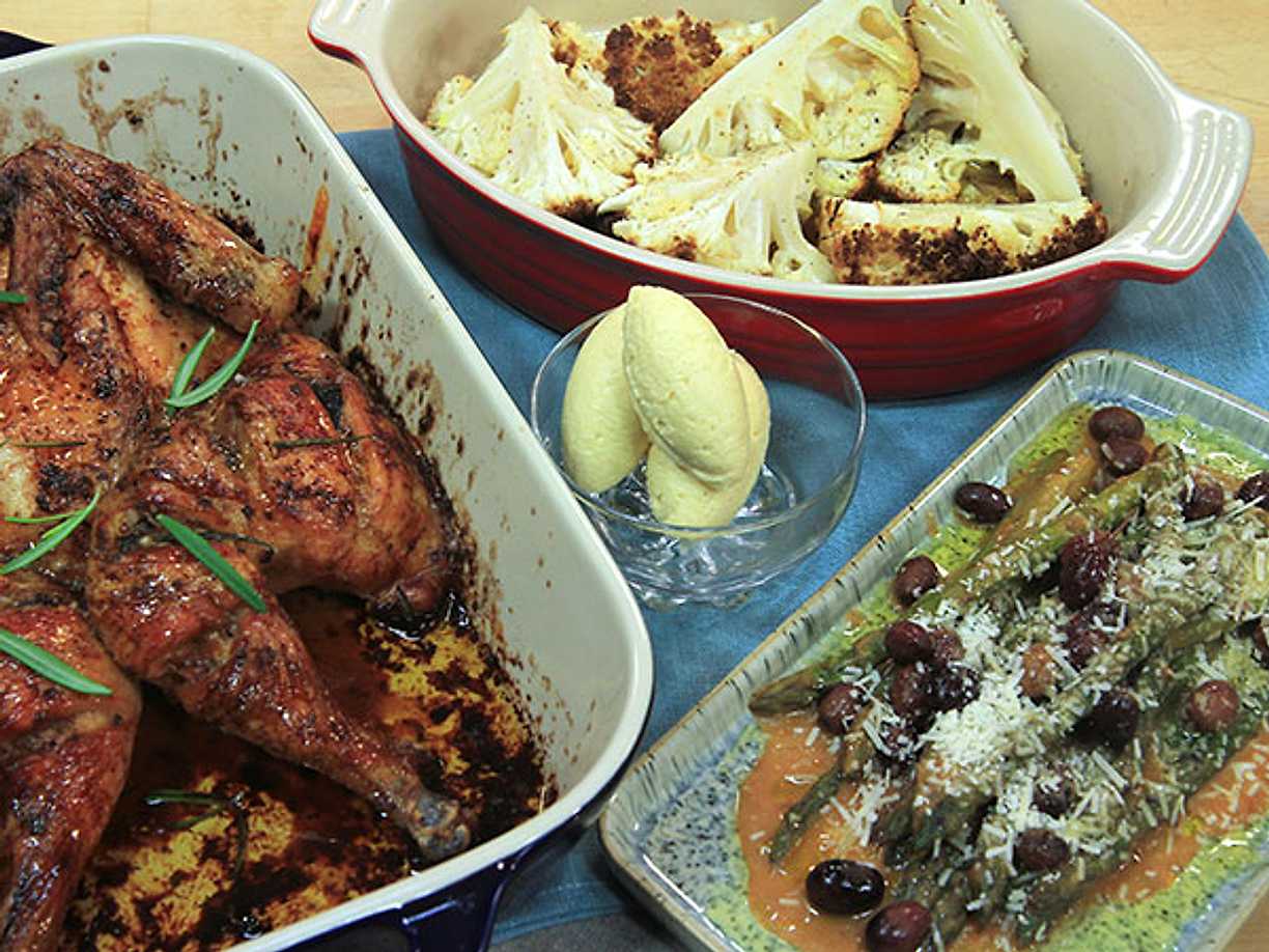 Hel kyckling i ugn med ugnsbakade tillbehör samt honungs- och fetaostsås